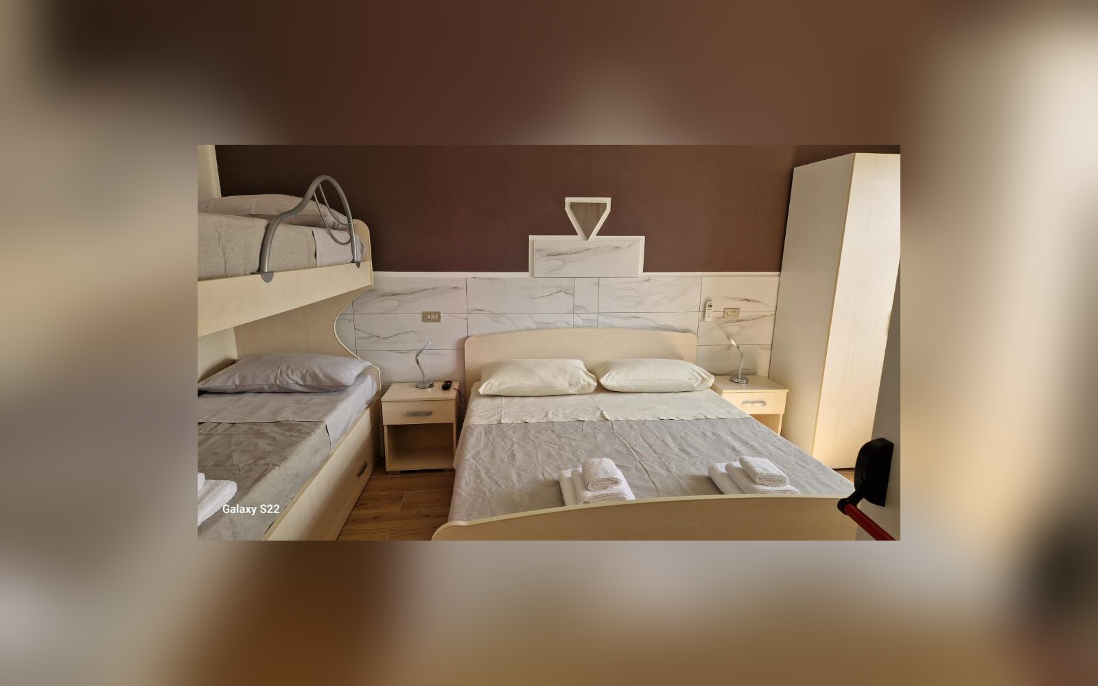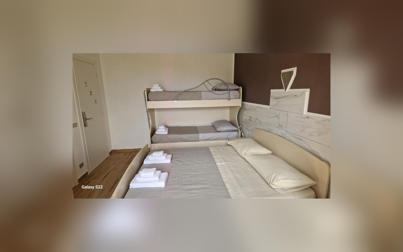 Camera di circa 20 mq con bagno privato e splendida vista sul mare. Come la camera con vista montagna, dispone di un letto matrimoniale e un letto a castello (letto estraibile), per accogliere fino a 5 ospiti. Progettata e attrezzata per garantire piena accessibilità agli ospiti con disabilità. Dotata di aria condizionata, Smart TV, WiFi e mini frigo bar. Tutti i letti sono alti 25 cm.